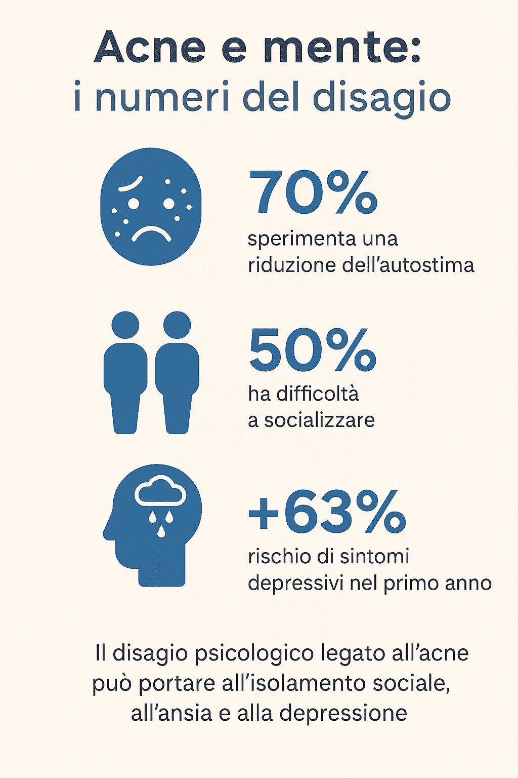 L’acne viene spesso vissuta come un fastidio estetico, ma per molti rappresenta un vero peso emotivo. L’umore ne risente, così come la percezione di sé. In alcuni casi si può arrivare all’isolamento sociale, all’ansia anticipatoria, e persino a episodi di depressione clinica.