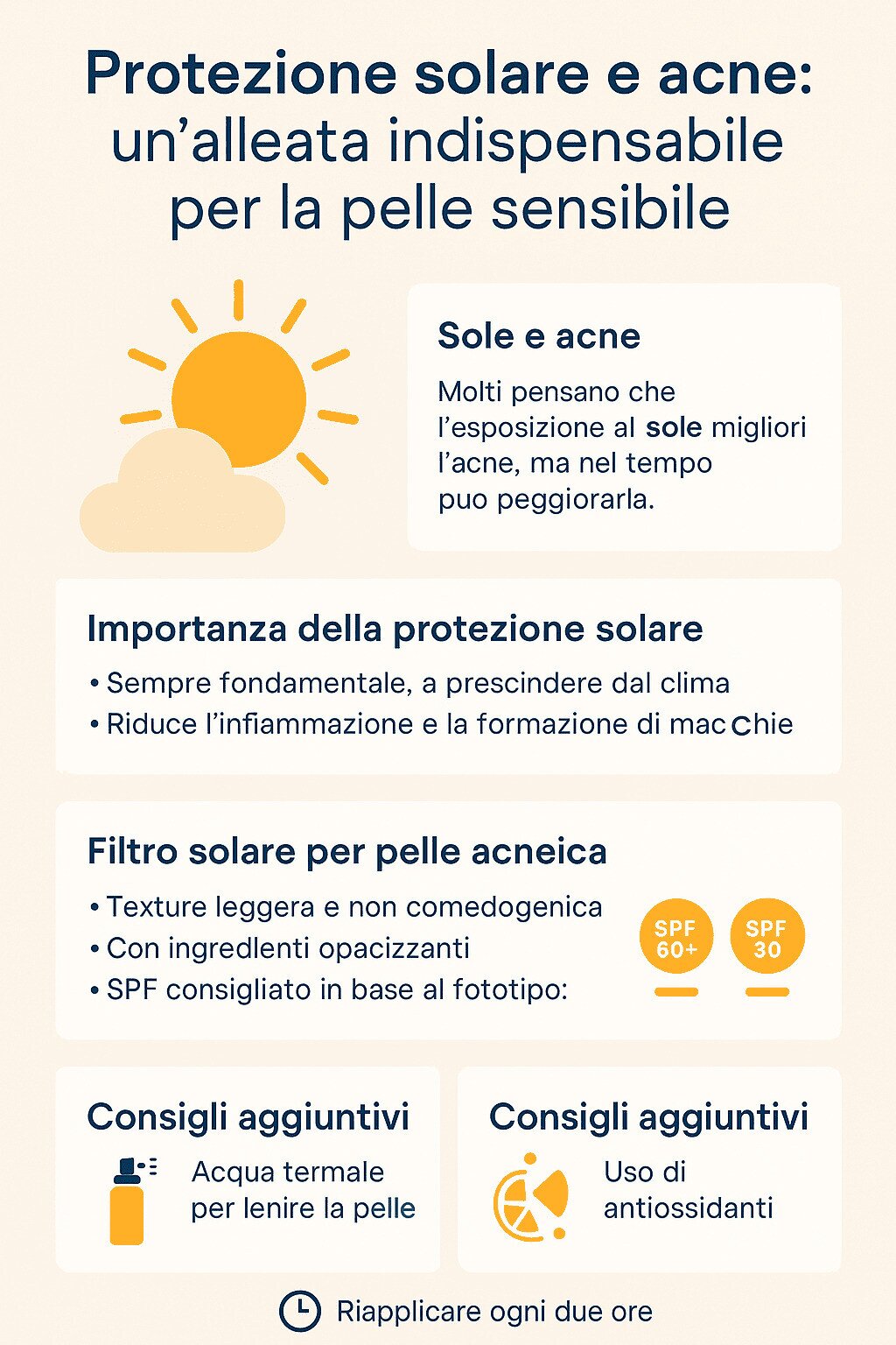 Al termine dell’estate, quando la pelle inizia a desquamarsi e l’abbronzatura svanisce, compaiono spesso nuove lesioni acneiche, più profonde e infiammate. Un vero paradosso, considerando quanto spesso il sole venga erroneamente percepito come “cura naturale”.